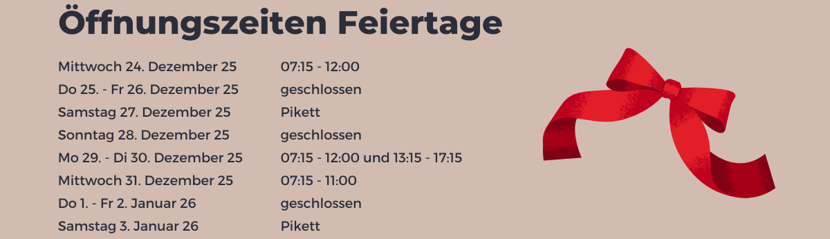 Unseren 24h-Pikettdienst erreichen Sie bei Notfällen natürlich auch während den Feiertagen. Wir sind für Sie da, bei Bedarf 365d / 24h.