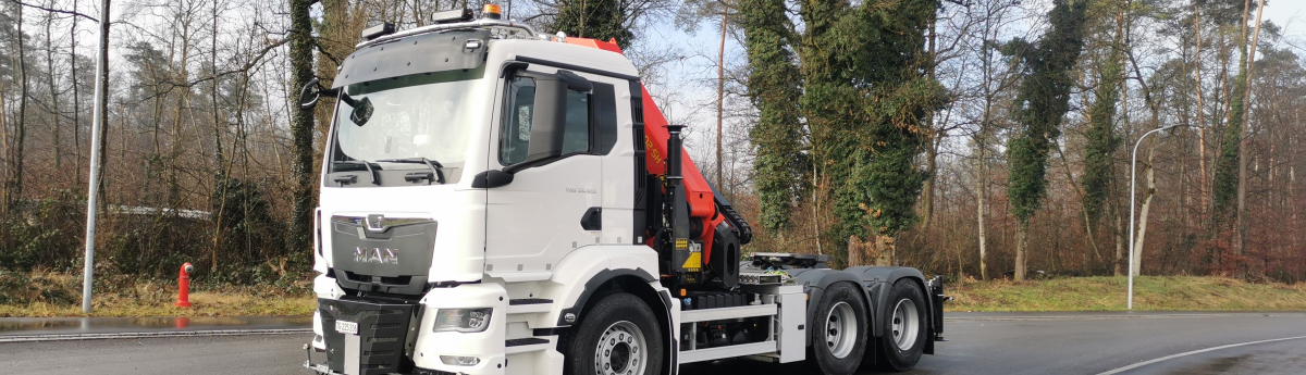 Wir durften gleich zwei Fahrzeuge zur Erneuerung des Fuhrparks liefern. Der MAN TGS 33.520 6x4 mit Brücke und Ladekran bietet eine enorme Transportfläche für Baumaterialien und Container. Der zweite MAN TGS 33.520 6x4 wurde ebenfalls mit einem Kran ausgestattet. Zusätzlich zur Sattelkupplung wurde eine abnehmbare Brücke für den Wechseleinsatz Sattelschlepper/Anhängerzug aufgebaut. Somit können Baumaterialien wie auch Baumaschinen bequem zur Baustelle transportiert werden. Mit den Arbeitsscheinwerfern ist auch für klare Sicht in der Dunkelheit gesorgt.